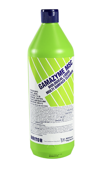 Unitor™ Gamazyme™ MSC is effective in cleaning or removing organic residues from hard and soft surfaces, such as urine, dog faeces, food, milk, chocolate syrup, tomato sauce, etc.