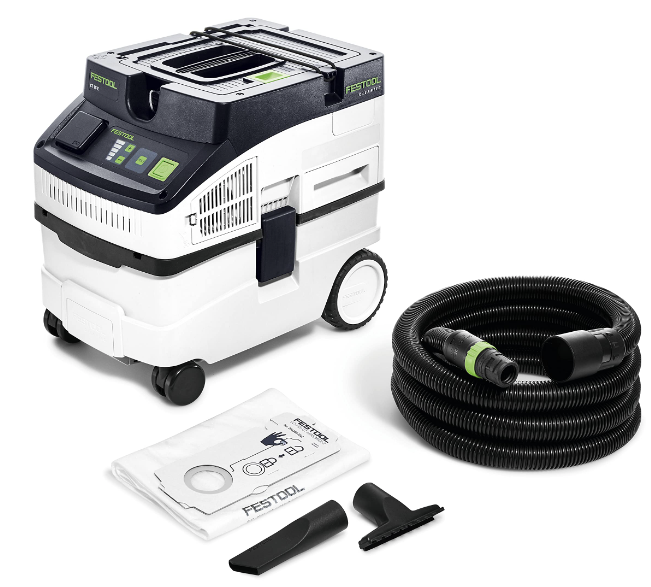 Compact but large. Light but powerful. Whether it's used on the construction site or in the workshop, thanks to its huge container capacity of 36 l, the CLEANTEC CTL 36 provides maximum volume with compact dimensions. Equipped with swivelling castor wheels and rear wheels for optimum mobility. It also has a locking brake that provides stability on any surface as well as during transport. The flat filter fully integrated in the suction head ensures the full volume is utilised: This means that the gross and net container volumes are virtually identical. The extremely compact high-performance turbine provides the right suction power. A 3900 l/min volume flow means that nothing remains except clean air. Approved for dust in dust class L.